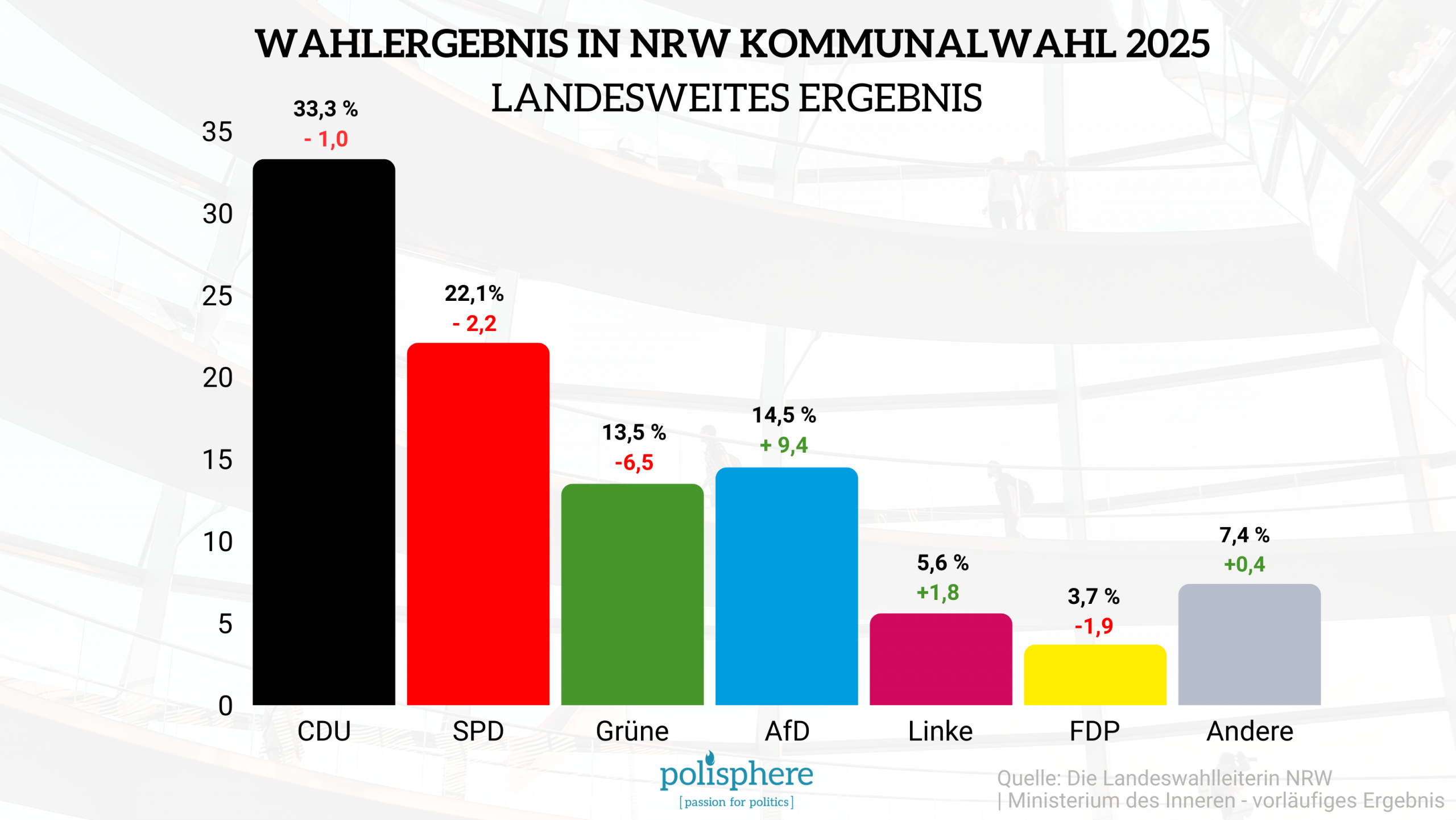 Das sind die einen Zahlen der Kommunalwahlen in Nordrhein-Westfalen, “der kleinen Bundestagswahl”. Die anderen geben vor allem der Union Gelegenheit zum Aufatmen. Die CDU bleibt mit landesweit 33,3 % stärkste Kraft – in etwa so viel wie bei ihrem bisherigen Rekordtief von 2020 (34,3 %). Die SPD folgt mit 22 ,1 %, womit sie ihren historischen Tiefstwert von 24,3 % im Jahr 2020 nochmals unterbot. Die Grünen rutschten von ihrem bisherigen Bestwert (20 %) auf nur noch 13,5 % ab, während die FDP statt früher 5,6 % jetzt nur noch etwa 3,7 % erreichte. Dagegen konnte die Linkspartei leicht zulegen und kommt nun auf über 5 %. Besonders bemerkenswert ist der Erfolg der AfD: Mit landesweit 14,5 % hat sie ihr Ergebnis von 2020 (5,1 %) mehr als verdreifacht.