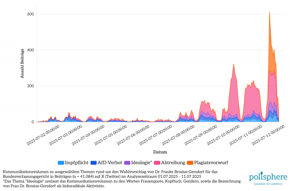SPD: Obwohl Brosius-Gersdorf Kandidatin auf Vorschlag der SPD war, spielten weder Partei noch Einzelaccounts eine große Rolle – weder in der Gegenkommunikation noch als Projektionsfläche im Sinne des kommunikativen Drucks.