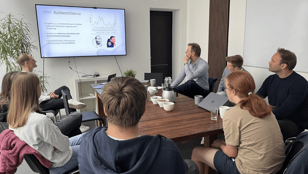 Zu Beginn gaben polisphere-Geschäftsführer Philipp Sälhoff, Projektmanagerin Hannah Schimmele und Junior Researcher Philipp Bosch zunächst einen Einblick in die Arbeit von polisphere zu den Themen Desinformation, Antisemitismus, KI, Recruiting und demokratische Netzwerkarbeit. Anschließend wurde intensiv über Populismus, seine Gefahren und mögliche Gegenstrategien diskutiert. Auf besonderes Interesse stießen hierbei das Framing politischer Sachverhalte, die Überprüfung der Validität von Informationen sowie die Nutzung von TikTok durch Politiker:innen demokratischer Parteien, insbesondere im Hinblick auf eine zielgruppengerechte Ansprache von Jugendlichen.