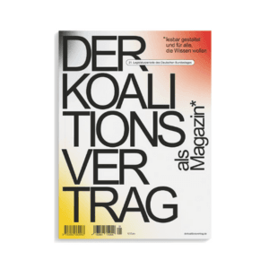 Der neue Koalitionsvertrag ist jetzt auch als Magazin erhältlich – gestaltet von Oliver Wurm und seit dem 10. Mai 2025 für 12 Euro an Bahnhofskiosken verfügbar. Das 172-seitige Heft macht den politischen Vertrag durch Fotos, Illustrationen und ein modernes Layout zugänglicher. Entstanden ist das Projekt gemeinsam mit der Journalistin Sabine Cole und Studierenden der HAWK Hildesheim. Ziel ist es, politische Inhalte anschaulicher zu vermitteln und das demokratische Engagement zu stärken. Das Magazin versteht sich als Einladung, sich aktiv mit Regierungsarbeit auseinanderzusetzen.