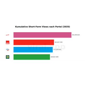 Eine Analyse von Felix Vemmer über 32.443 Short-Form-Videos von verifizierten Bundestags-Accounts zur Bundestagswahl im vergangenen Jahr zeigt eine enorme Aufmerksamkeitskonzentration: knapp 50 % der 1,01 Milliarden Views entfielen auf nur ein Prozent der Beiträge. Die klare Spitzenreiterin ist Die Linke (301 Mio. Views), obwohl mit den wenigsten Accounts, gefolgt von der AfD (195,5 Mio.) und der SPD (193,2 Mio.). Die Top 3 der Politischen Influencer:innen, auf Platz 1 Alice Weidel, Heidi Reichinnek auf Platz 2 und der Berliner Bundestagsabgeordnete Ferat Koçak auf Platz 3, weisen dabei allein 120 Mio. Views vor.