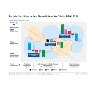 Mit Blick auf die anstehenden Landtagswahlen, beginnend im März in Baden-Württemberg und Rheinland-Pfalz, erweitert SINUS-Direktorin Dr. Silke Borgstedt ihre Analyse der Bundestagswahl um eine zentrale Prognose: Der politische Kampf entscheidet sich in der “diagonalen Pufferzone“ der Gesellschaft. Während sich an den Rändern „Modernisierungsmotivierte“ und “Skeptiker“ unversöhnlich gegenüberstehen, ist für die wahlentscheidenden Milieus der Mitte – von Konservativ-Gehobenen bis zu Hedonisten – allein die pragmatische Lösungsstabilität relevant. Für diese Gruppen gilt die Logik einer “Lieferando-Demokratie“, in der der Staat liefern und der Alltag funktionieren muss; gelingt den Parteien der Mitte hier kein glaubwürdiges Angebot, droht sich die im Bund beobachtete Spaltung 2026 in den Ländern zu verhärten.