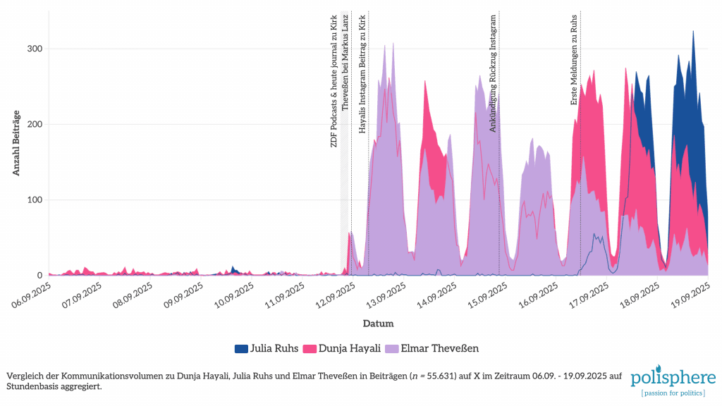 Einen zweiten Peak hatten der Diskurs um Hayali nach Bekanntgabe ihres temporären Social-Media-Rückzugs. Während der Diskurs zu Theveßen langsam ausfadete, kam der Fall von Julia Ruhs seit Donnerstag sehr prominent hinzu.