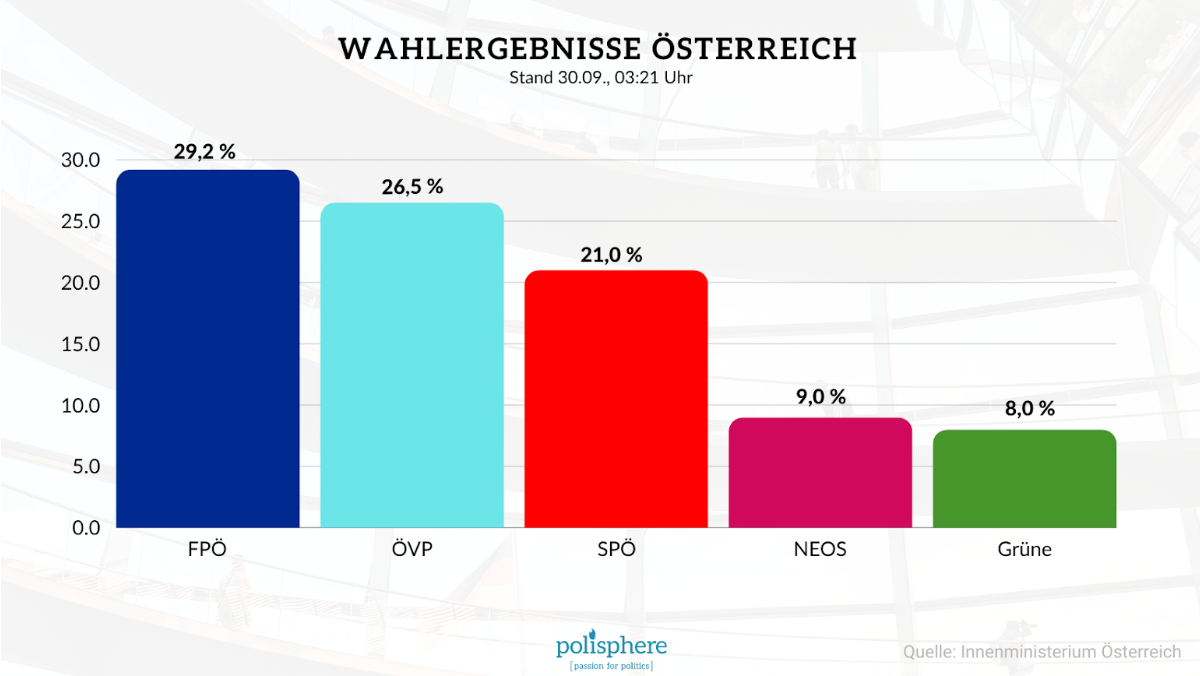 Gegen einen Rechtsruck wollen sich auch fast alle Parteien in Österreich wehren, denn bei der gestrigen Nationalratswahl konnte die rechtsnationale FPÖ mit 29,2 % erstmals stärkste Kraft werden. Die bisher regierende ÖVP erreicht mit einem Minus von 11 Punkten und 26,5 % nur Platz 2, gefolgt von der SPÖ mit 21 %. FPÖ-Chef Herbert Kickl, der aus dem Alpenland ein „zweites Ungarn“ machen will, wird wahrscheinlich dennoch nicht Kanzler: