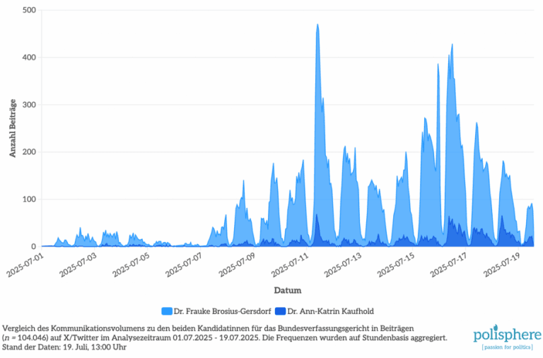 Wir haben das Kommuikationsvolumen auf X zu beiden Kandidat:innen seit dem 1. Juli verglichen – insgesamt mehr als 100.00 Posts. Die Kommunikation zu Ann-Katrin Kaufhold ist im Vergleich zu Brosius-Gersdorf deutlich geringer, hat aber in den letzten Tagen eine neue Dynamik bekommen. Kaufhold wird in den rechten bis rechtspopulistischen Netzwerken als die „Gefährlichere“ von beiden gezeichnet, die man „nicht vergessen sollte“.