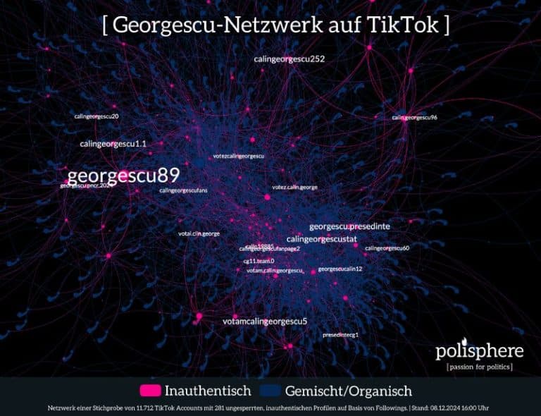 In Rumänien muss die Präsidentschaftswahl wegen massiver Einflussnahme auf TikTok wiederholt werden. Neben bezahlten Influencern mit Millionen von Followern bestand die Kampagne des pro-russischen Kandidaten Calin Georgescu aus tausenden inauthentischen Accounts, die wellenhaft eigene Inhalte posten, Spam-Kommentare unter Videos der politischen Gegnern platzierten und dabei mit strategischer Hashtag-Nutzung Reichweite generierten. Eine professionell aufgesetzte und mehrdimensionale Manipulationskampagne.